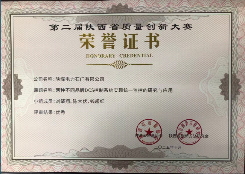 陜煤石電:《兩種不同品牌DCS控制系統(tǒng)實(shí)現(xiàn)統(tǒng)一監(jiān)控的研究與應(yīng)用》獲陜西省質(zhì)量創(chuàng)新大賽優(yōu)秀獎(jiǎng)